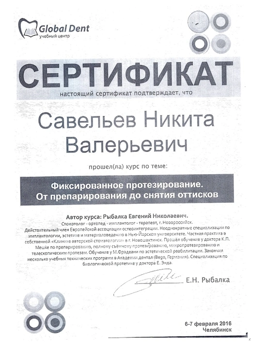 - В 2016 году прошёл обучение на курсе - «Фиксированное протезирование. От препарирования до снятия оттисков», Челябинск
