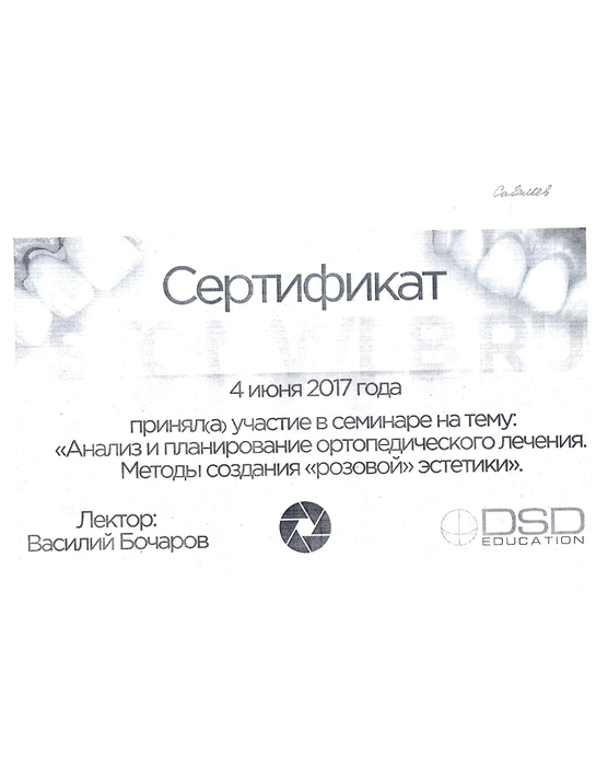 - В 2016 году прошёл обучение на курсе - «Анализ и планирование ортопедического лечения. Методы создания «розовой» эстетики»