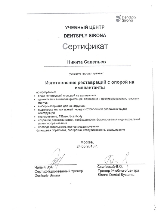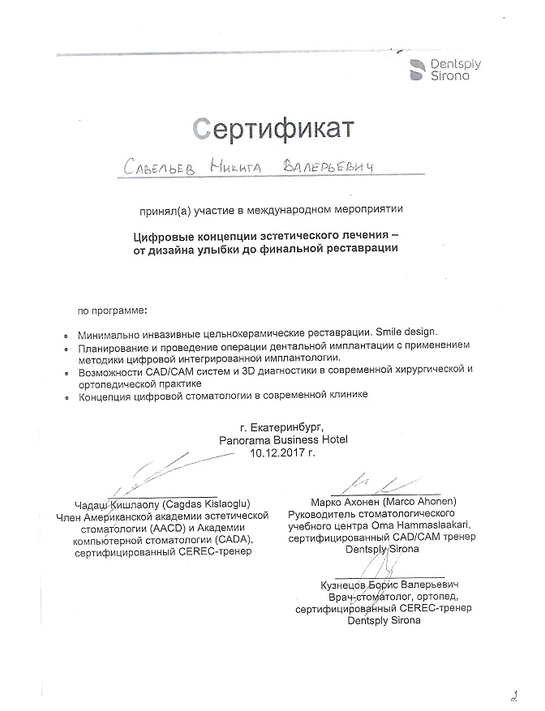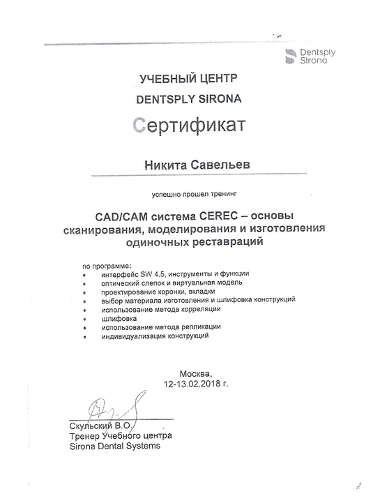- В 2018 году прошёл обучение на курсе - «CAD/CAM система CEREC- основы сканирования, моделирования и изготовления одиночных реставраций», Москва