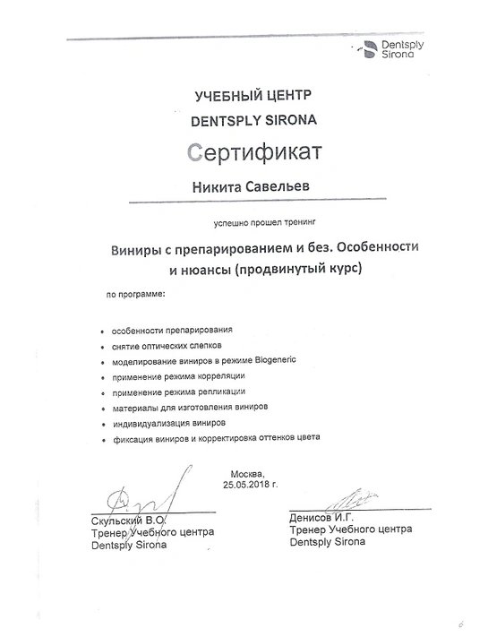 - В 2018 году прошёл обучение на курсе - «Виниры с препарированием и без. Особенности и нюансы (продвинутый курс)», Москва