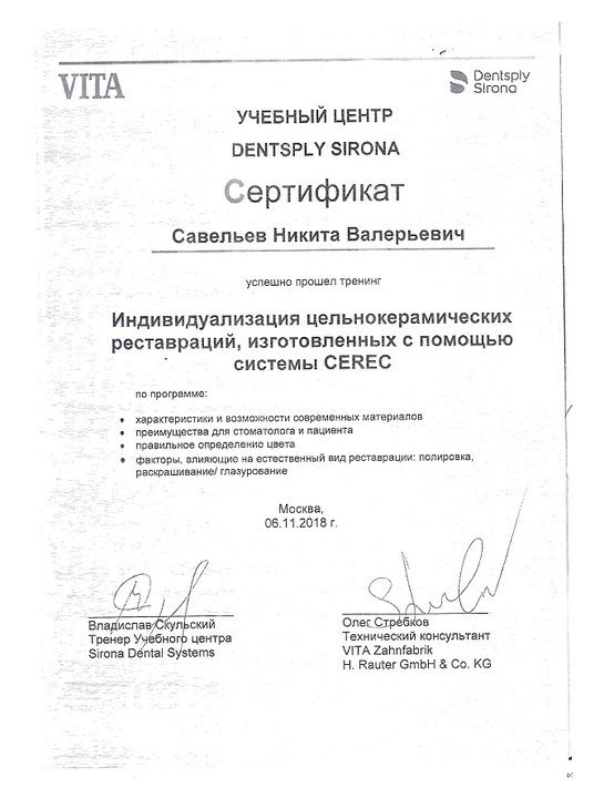 - В 2018 году прошёл обучение на курсе - «Индивидуализация цельнокерамических реставраций, изготовленных с помощью системы CEREC», Москва