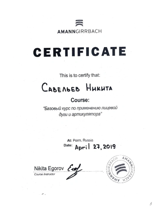 - В 2019 году прошёл обучение на курсе - «Базовый курс по применению лицевой дуги и артикулятора, Пермь