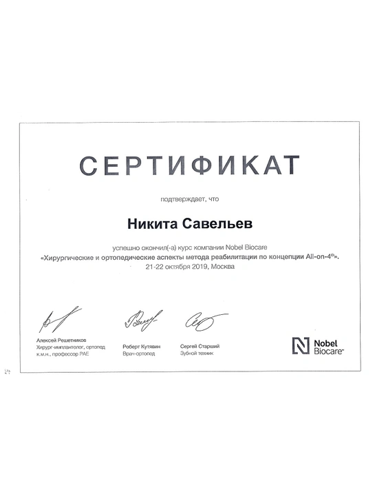 - В 2019 году прошёл обучение на курсе - «Хирургический и ортопедические аспекты метода реабилитации по концепции All-on-4», Москва