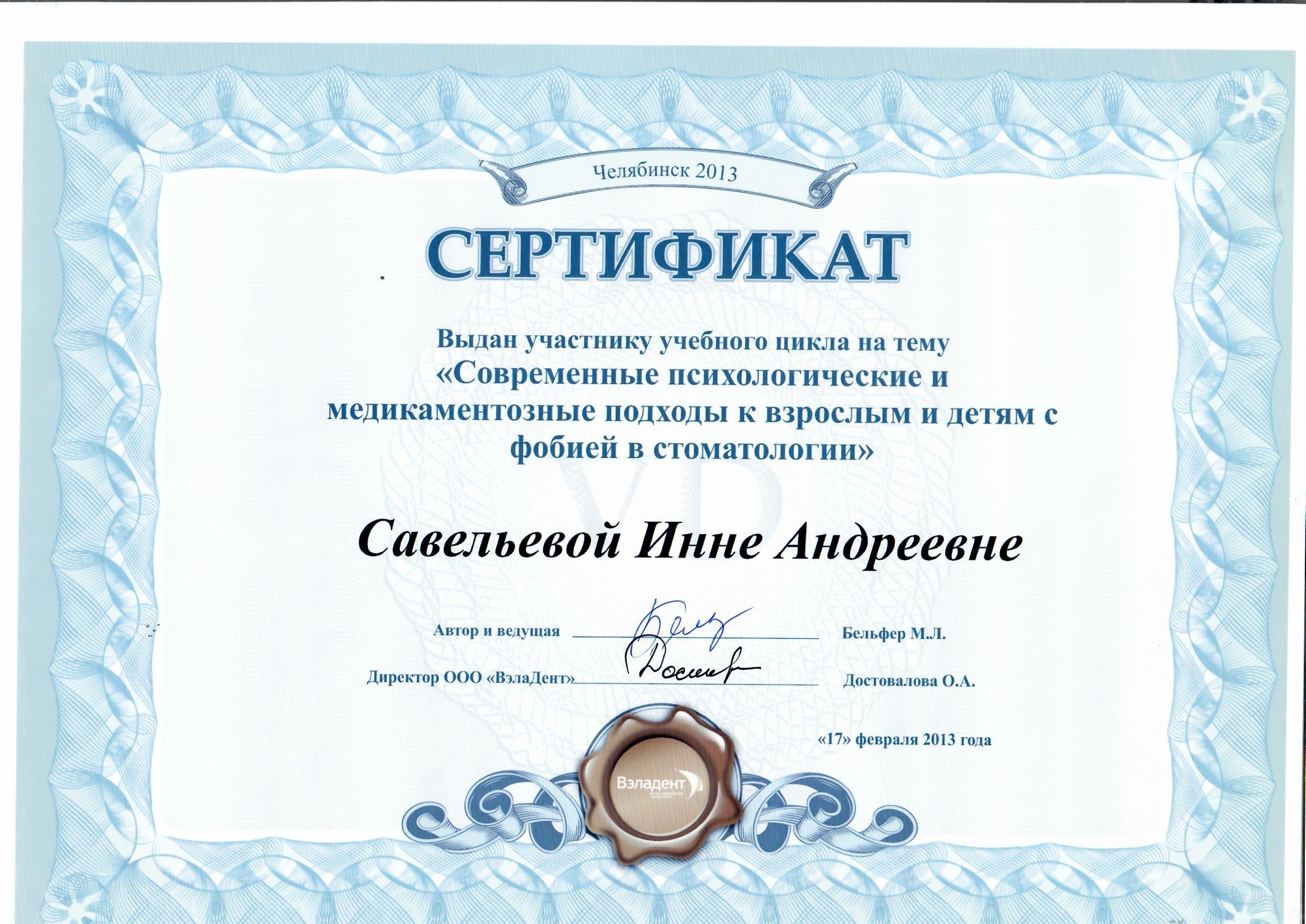 - В 2013 году получила сертификат учебного цикла «Современные психологические и медикаментозные подходы к взрослым и детям с фобией в стоматологии».