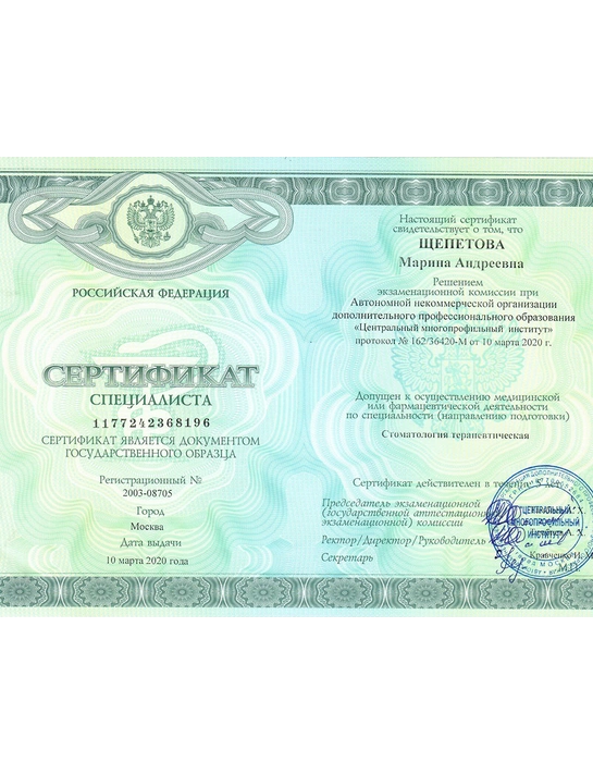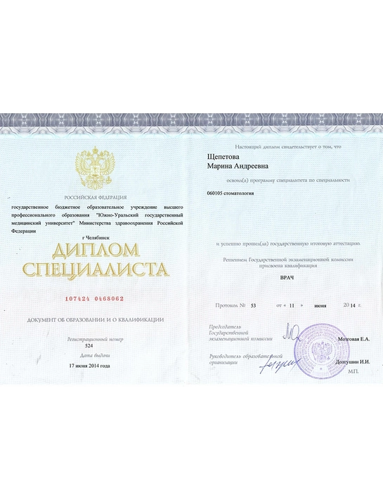 - Базовое образование: Южно-уральский Государственный Медицинский Университет по специальности «Стоматология» в 2014 году.