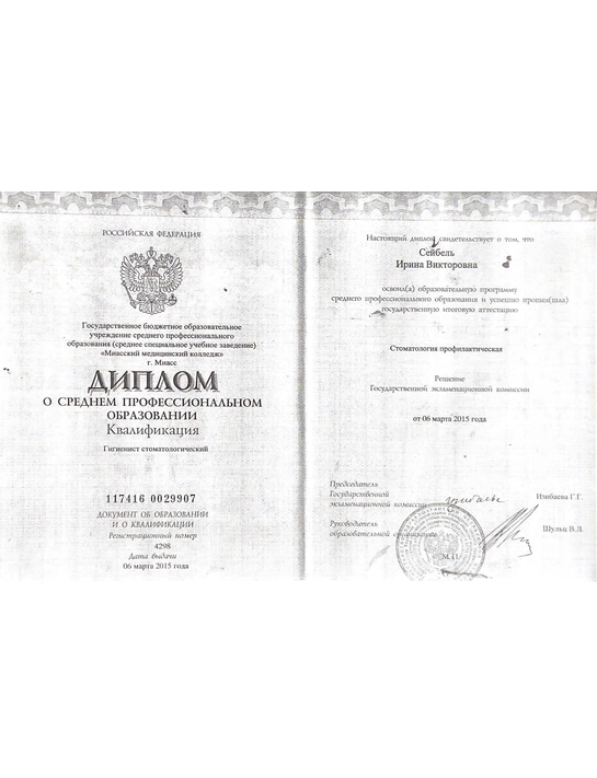 - Миасский медицинский колледж по специальности «Стоматология профилактическая» в 2015 г.