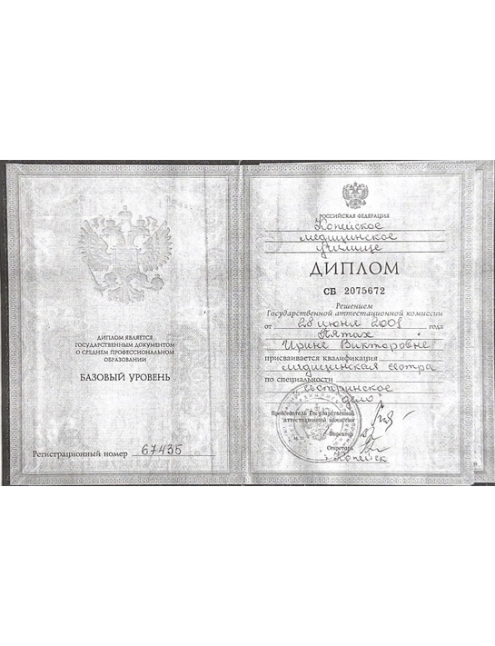 - Базовое образование: Копейское медицинское училище по специальности «Сестринское дело» в 2001 году.