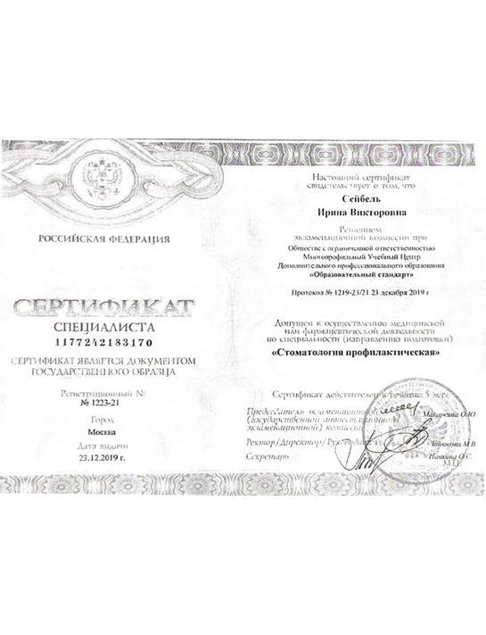 - В 2019 году получила сертификат семинара «Профилактика, реминерализация и инфильтрация».
