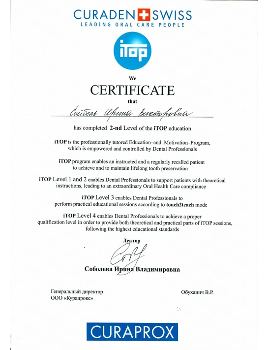 - В 2017 году получила сертификат курса «Лечение заболеваний пародонта».