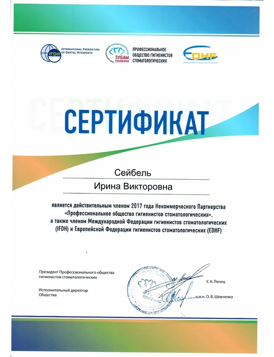 - В 2017 году получила сертификат международной конференции «Увидеть невидимое. Роль гигиениста стоматологического».