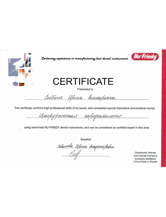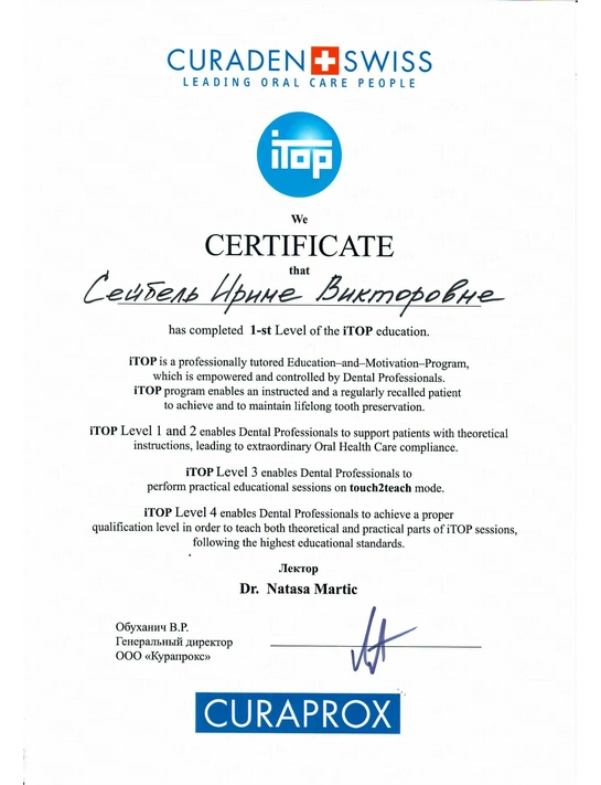 - В 2018 году получила сертификат мастер-класса «Нехирургическая пародонтология, профессиональная и индивидуальная гигиена от А до Я».