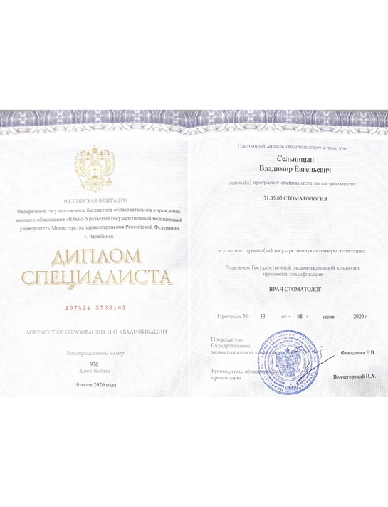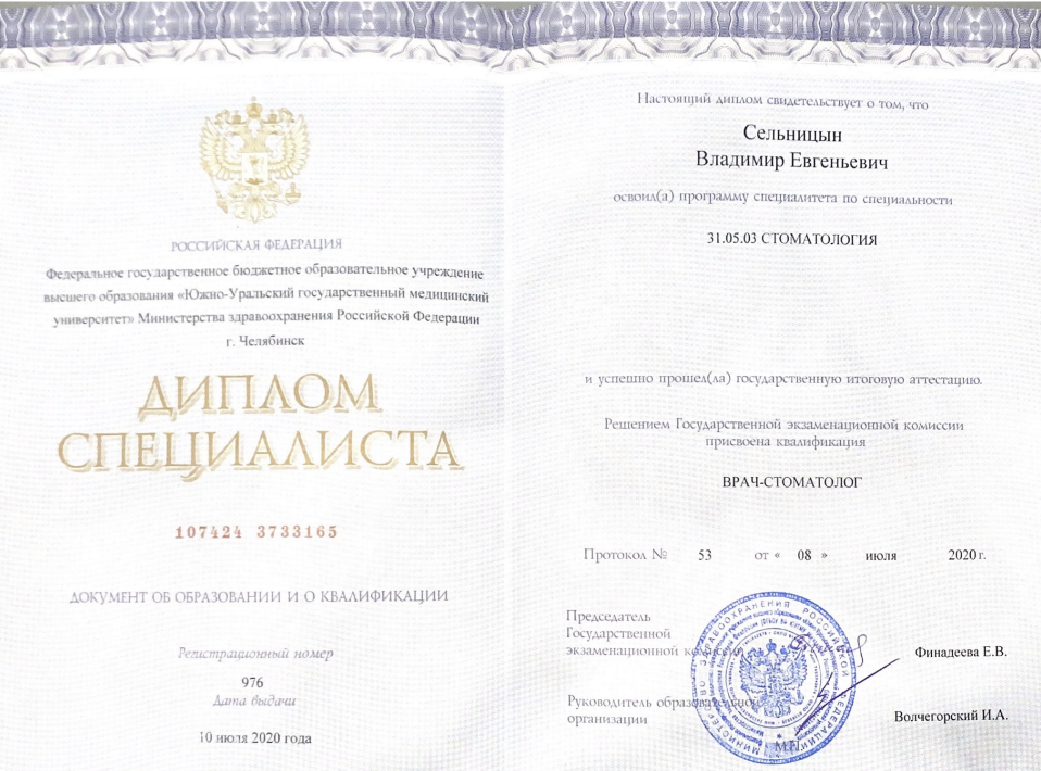 - Базовое образование: Южно-уральский Государственный Медицинский Университет по специальности «Стоматология» в 2020 году.
