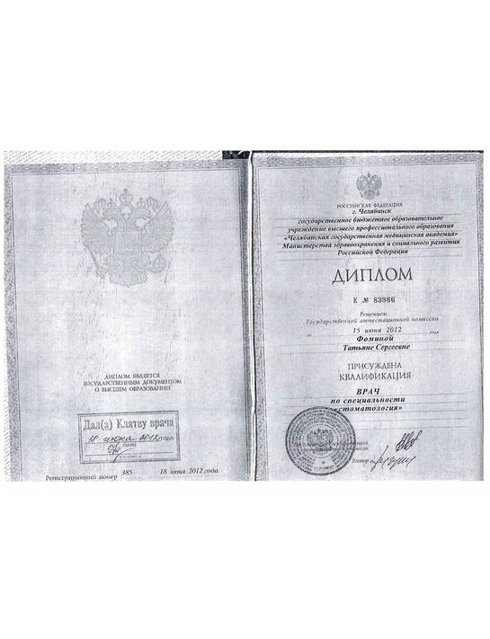 - Базовое образование: Челябинская Государственная Медицинская Академия по специальности «Стоматология» в 2012 году.