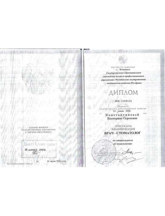 - Базовое образование: Государственное образовательное учреждение высшего профессионального образования «Челябинская государственная медицинская академия Федерального агентства по здравоохранению и социальному развитию» по специальности «Стоматология» в 2006 году.