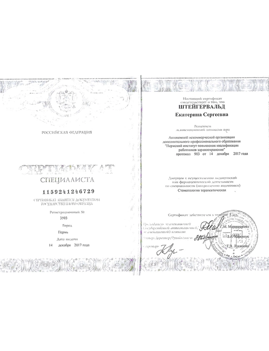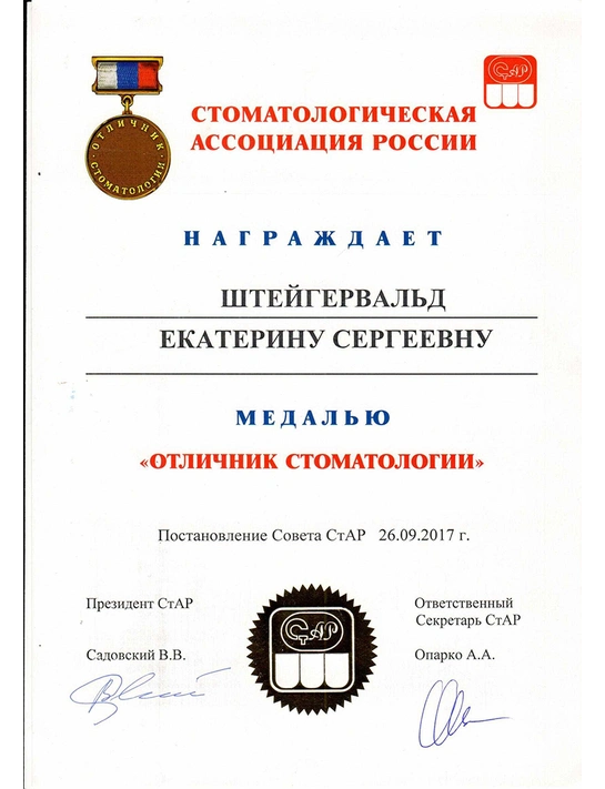 - В 2008 году получила сертификат обучения «Применение озона при лечении стоматологических заболеваний».