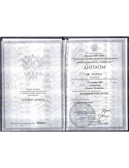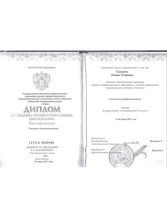 - Базовое образование: Миасский Медицинский Колледж «Гигиенист стоматологический» в 2015 году.