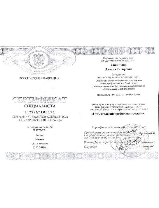 - В 2016 году получила сертификат симпозиума «Государственная программа профилактики стоматологических заболеваний».