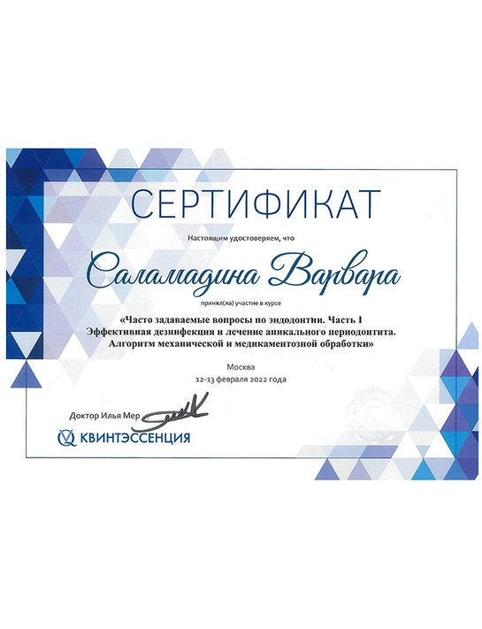 - В 2022 году приняла участие в курсе: "Часто задаваемые вопросы по эндодонтии. Часть 1. Эффективная дезинфекция и лечение апикального периодонтита. Алгоритм механической и медикаментозной обработки"
