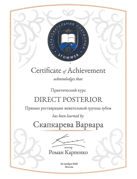 - В 2020 году прошла практический курс "Прямые реставрации жевательной группы зубов"