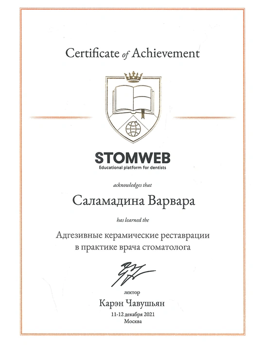 - В 2021 году прошла курс "Адгезивные керамические реставрации в практике врача стоматолога"