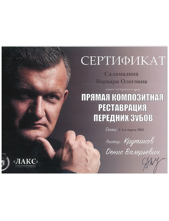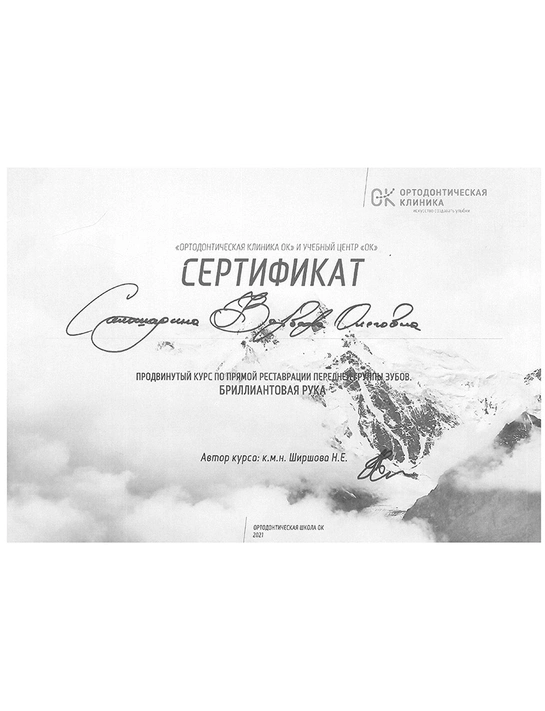 - В 2021 году прошла обучение по курсу "Прямая композитная реставрация передних зубов"