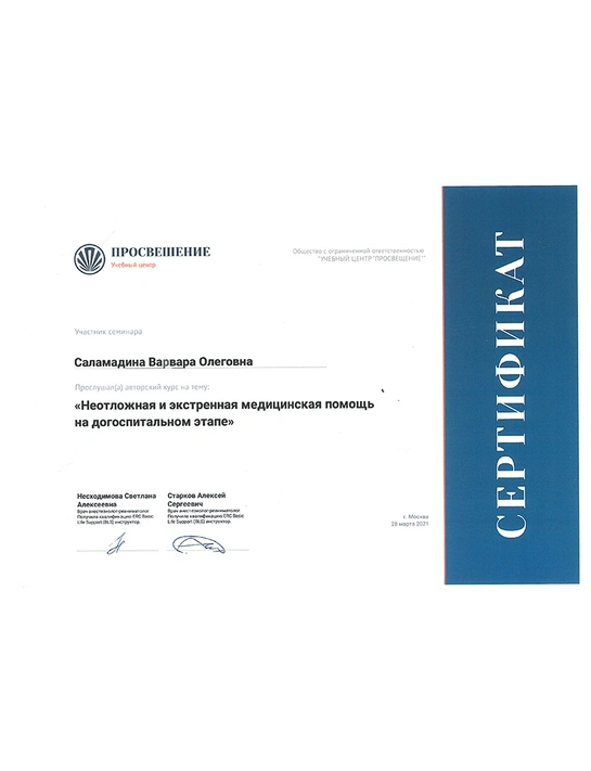 - В 2021 году прослушала авторский курс на тему: "Неотложная и экстренная медицинская помощь на догоспитальном этапе"