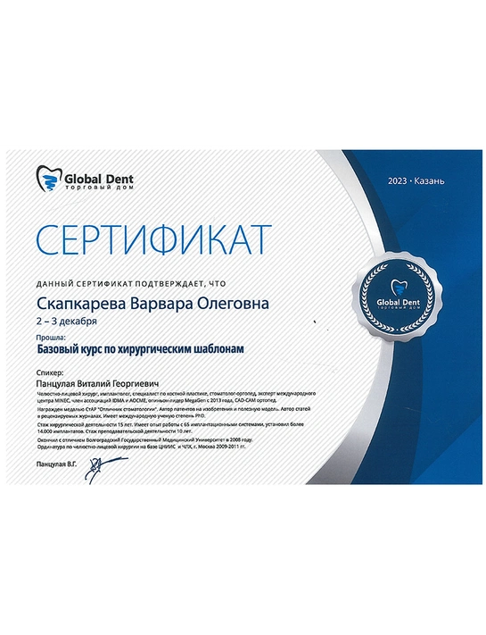 - В 2023 году прошла: "Базовый курс по хирургическим шаблонам"