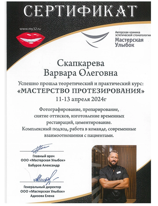 - В 2024 году прошла теоретический и практический курс: " Мастерство протезирования"