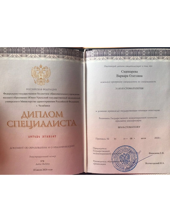 - Базовое образование: Южно-уральский Государственный Медицинский Университет по специальности «Стоматология» в 2020 году. Ординатура в 2023 году «Стоматология ортопедическая».