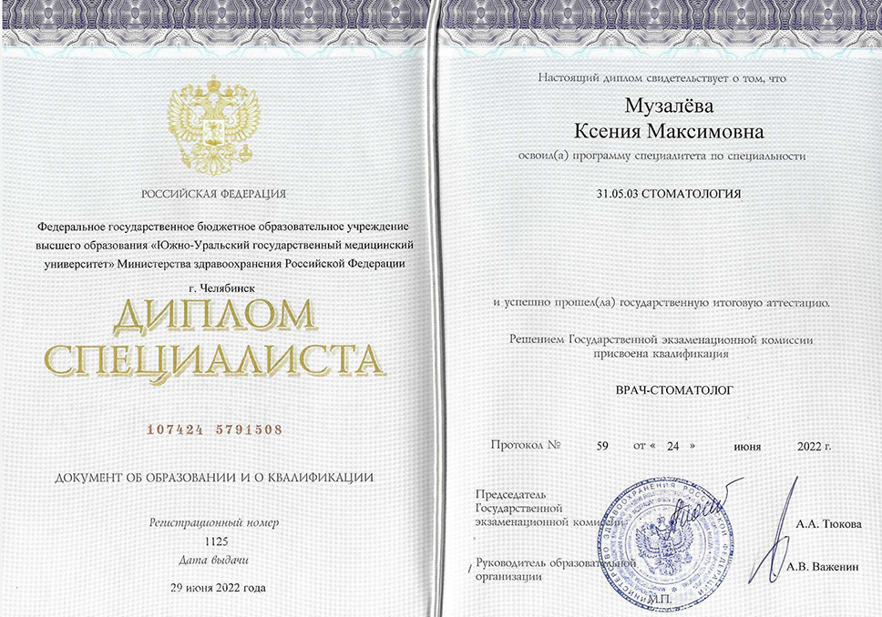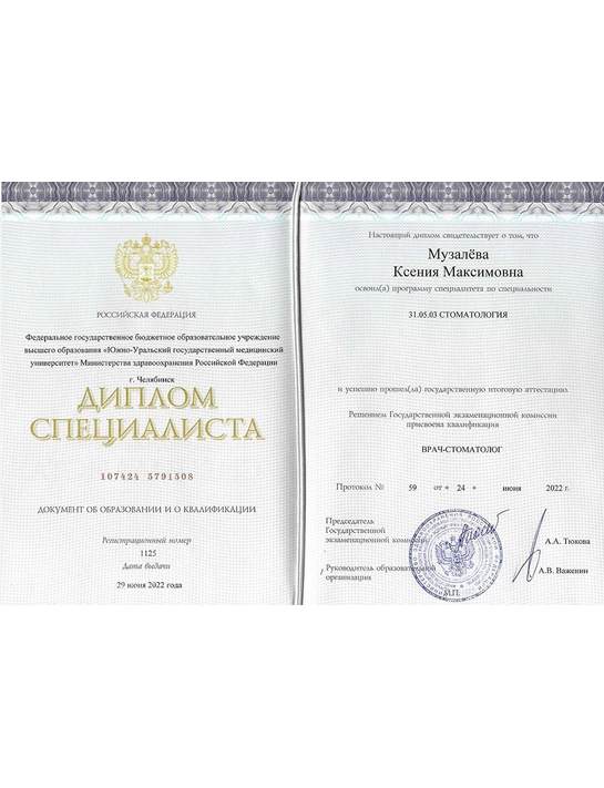 - Базовое образование: Южно-уральский Государственный Медицинский Университет по специальности «Стоматология» в 2022 году.